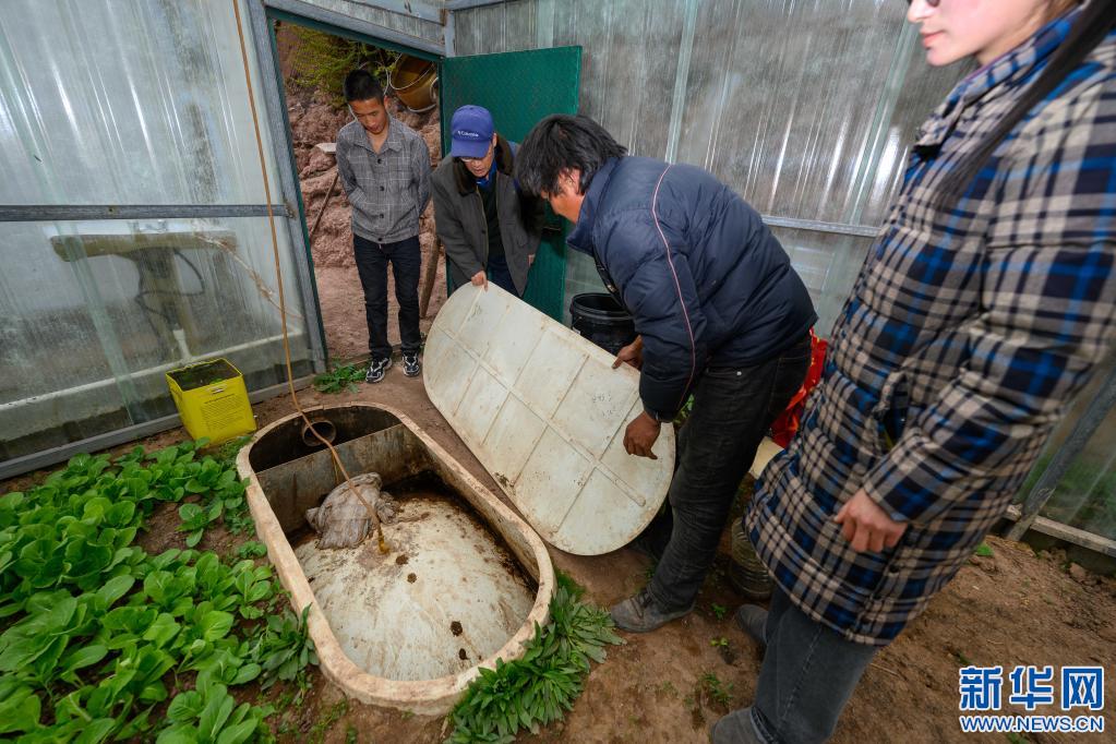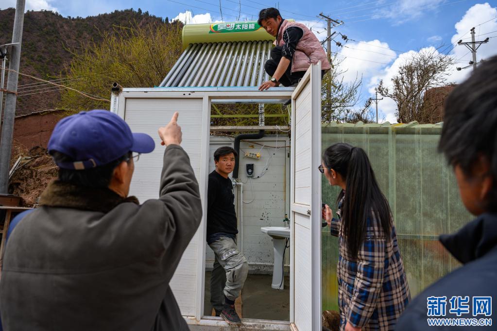 5月2日,在西藏昌都市類(lèi)烏齊縣濱達(dá)鄉(xiāng)濱達(dá)村,李純民(左二)在當(dāng)?shù)卮迕裣虬桶偷牵ㄓ叶┘抑胁榭凑託夤薜氖褂们闆r。新華社記者 劉金海 攝