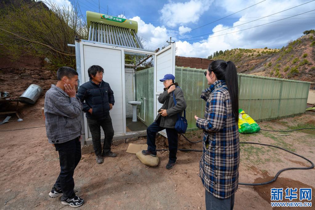 5月2日,李純民趕到西藏昌都市類(lèi)烏齊縣濱達(dá)鄉(xiāng)濱達(dá)村,為當(dāng)?shù)卮迕裣虬桶偷菂f(xié)調(diào)太陽(yáng)能熱水器的安裝調(diào)試工作。這是李純民(右二)通過(guò)濱達(dá)鄉(xiāng)小學(xué)老師索朗卓瑪(右一)作藏語(yǔ)翻譯,就熱水淋浴室與水沖廁整體改造計(jì)劃給向巴巴登(左二)提出建議。新華社記者 劉金海 攝
