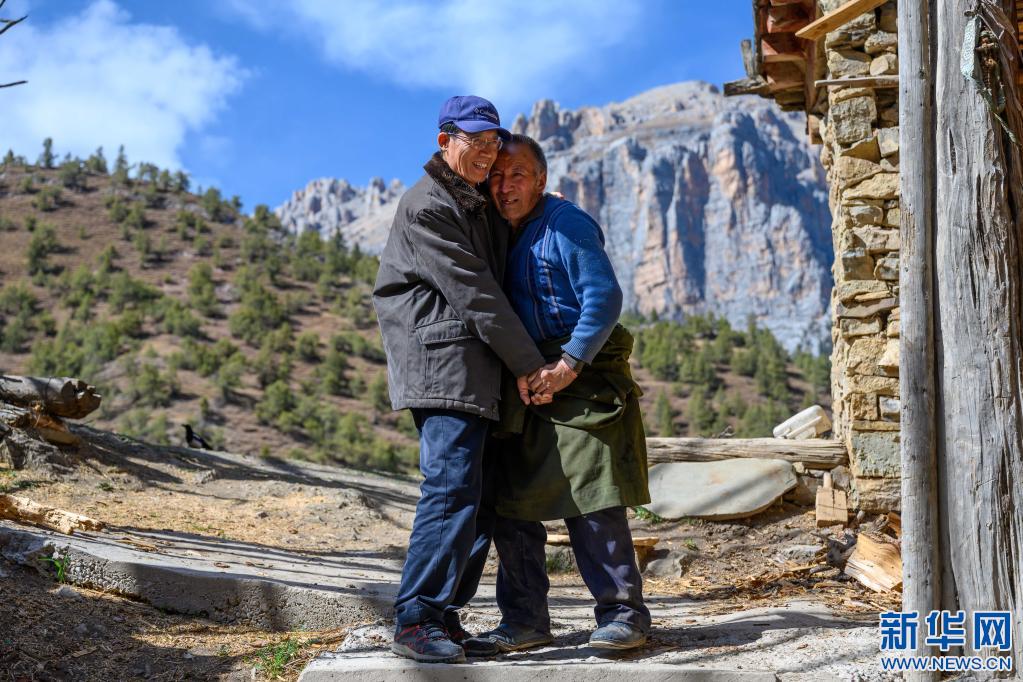 5月3日,李純民前往西藏昌都市類(lèi)烏齊縣伊日鄉(xiāng)崩日村看望1979年下鄉(xiāng)工作時(shí)結(jié)識(shí)的房東一家。這是房東的大兒子澤仁多加(右)在家門(mén)口熱情歡迎他。新華社記者 劉金海 攝
