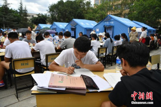 5月22日,云南省大理州漾濞縣漾濞一中的高三學(xué)生在露天“教室”備戰(zhàn)高考。5月21日,當(dāng)?shù)剡B發(fā)多次地震,最高6.4級(jí)。 中新社記者 劉冉陽(yáng) 攝