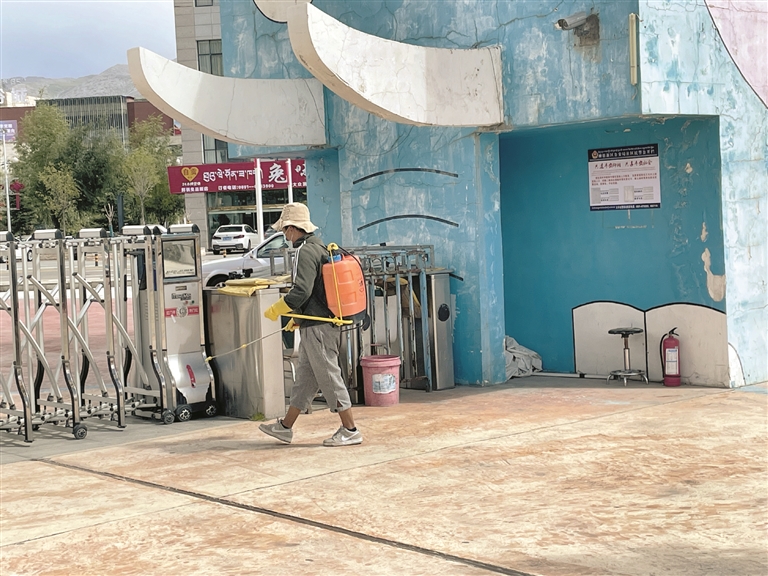 圖為在德吉羅布兒童樂園入口處,工作人員正在進行消毒作業(yè)。 拉薩融媒見習記者 索朗曲珍攝