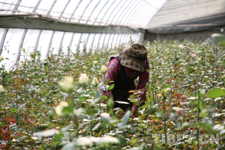 圖為工人正在玫瑰大棚內(nèi)對(duì)植株修整除草
