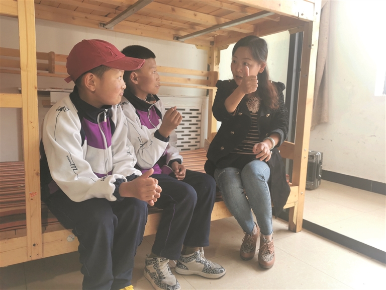 拉薩市特殊教育學校的老師譚倩和學生在宿舍里交流。