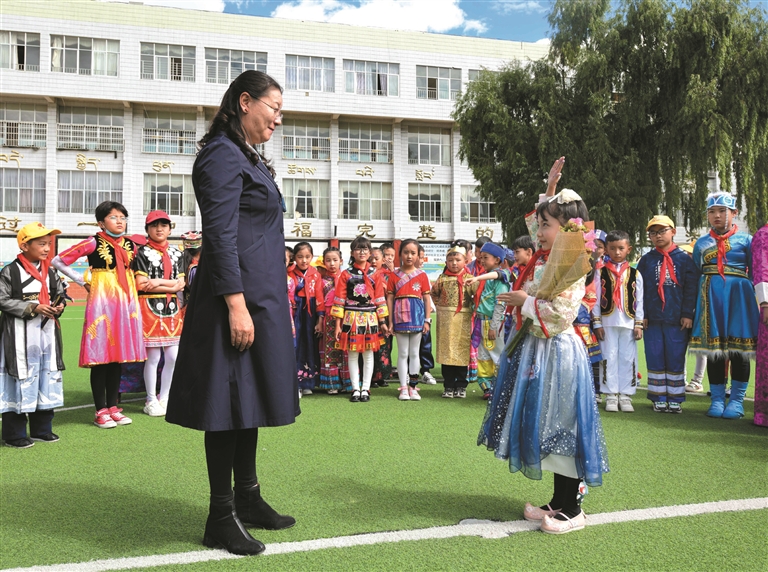 拉薩市第一小學的孩子身著節(jié)日盛裝,向老師敬獻鮮花。