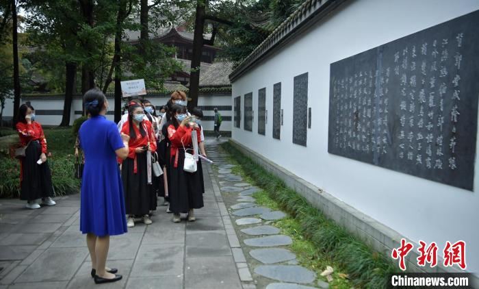 在成都的港澳臺僑大學生們跟隨講解員參觀杜甫草堂博物館。 劉忠俊 攝