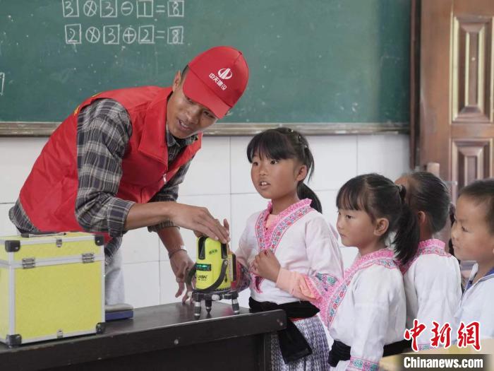 圖為孩子們體驗操作激光掃平儀?!±罾^嬌 攝
