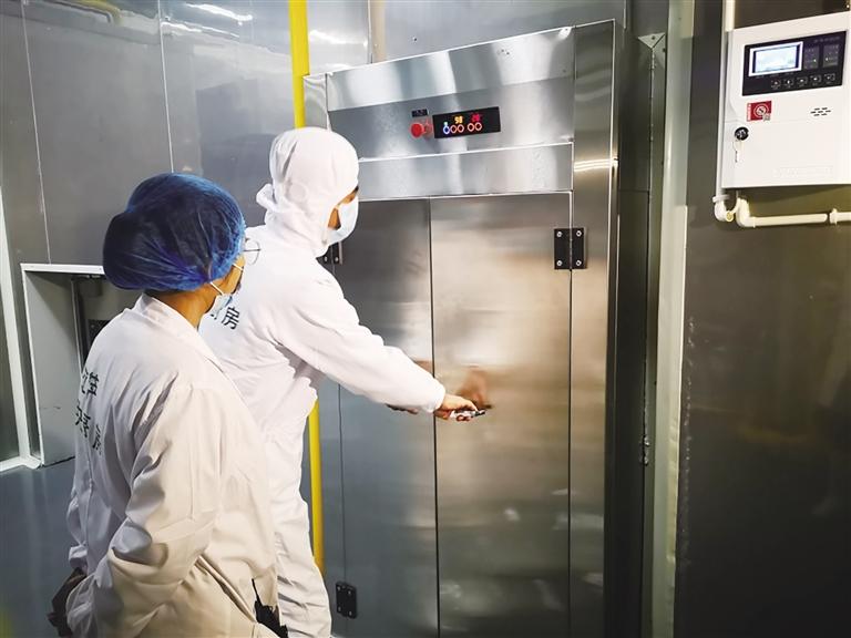 通過員工通道,在該廚房生產(chǎn)廠長甘文忠的指導(dǎo)下,記者穿上了白色工作服、戴上食品安全帽,換上高筒膠鞋,洗手消毒、測量體溫、隨身攜帶的手機(jī)、首飾全部摘掉后,通過腳踏池進(jìn)入生產(chǎn)加工車間。