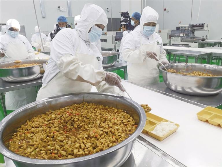 這些凈菜準(zhǔn)備好后,通過設(shè)備轉(zhuǎn)運(yùn)至熱菜烹炒車間,在這里有幾位廚師正在烹飪宮保雞丁、西紅柿炒蛋、青菜西紅柿湯等。這些凈菜經(jīng)過加工之后被運(yùn)送至分餐車間。餐盒經(jīng)高溫消毒后,工作人員將每一份米飯、熱菜取樣留存,然后開始分工分餐,打包好的餐盒通過加溫消毒后,裝進(jìn)保溫箱,運(yùn)送至配餐車內(nèi)。