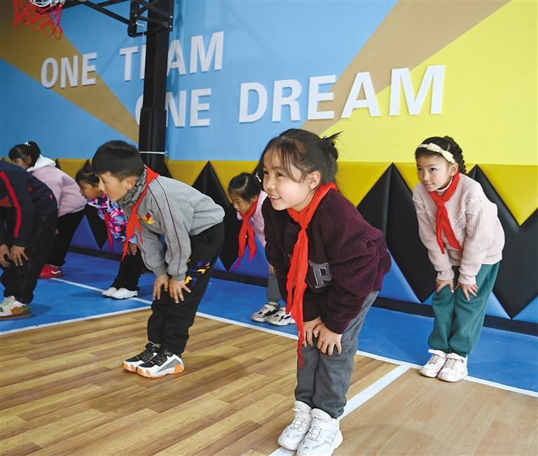 孩子們在教練的指導下開展熱身運動。記者 旦增蘭澤 攝