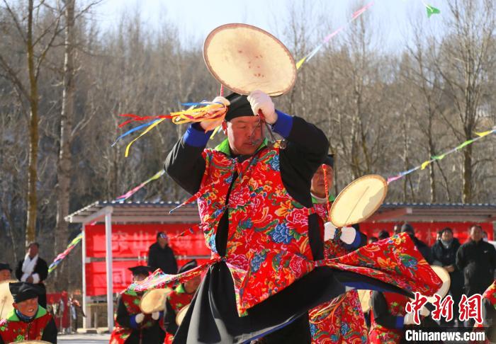 “我們會在每年春天播種前后,舉行廟會。會上由法師打著單面扇形羊皮鼓跳舞,祈求禳災避禍,平安吉祥。由于敲鼓時發(fā)出了‘梆、梆’聲響就稱它為梆梆會?!卑鸢鹞璺沁z傳承人李占森介紹,梆梆會是土族民俗祭祀文化保留最為完整的活動。