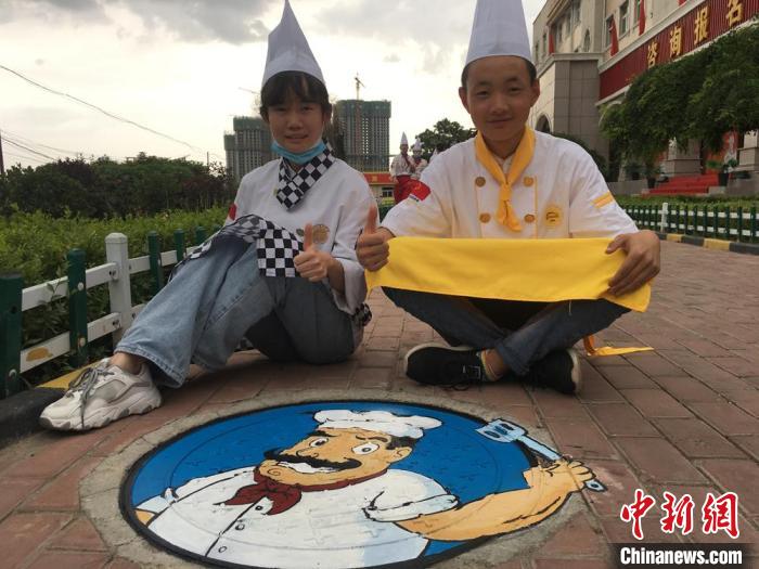 圖為蘭州一家烹飪職業(yè)院校學(xué)生給校園井蓋“換裝”。(資料圖) 張婧 攝