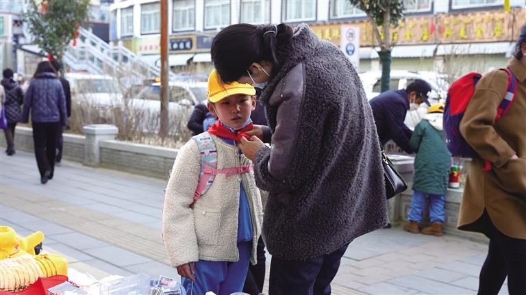 10日早上8時(shí)20分許,小學(xué)生們佩戴鮮艷的紅領(lǐng)巾、頭戴小黃帽,陸陸續(xù)續(xù)走進(jìn)拉薩市第一小學(xué)的校門。今年春季開學(xué)第一天,有些家長蹲在孩子面前,幫忙整理衣帽,同時(shí)鼓勵(lì)孩子“加油!”。