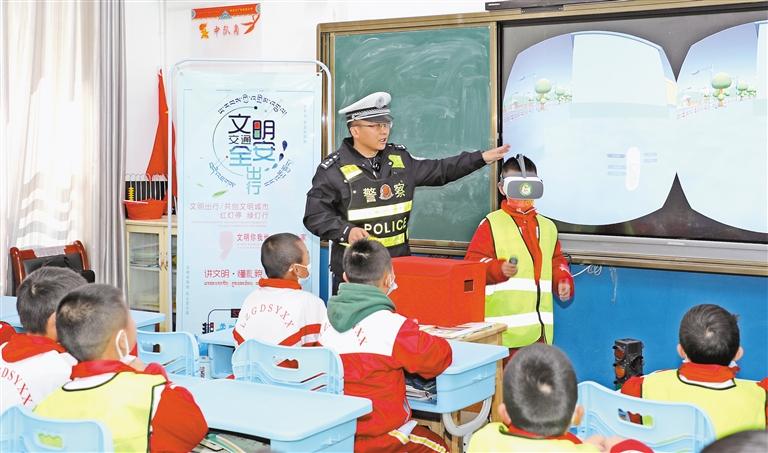 圖為林芝市公安局交警支隊(duì)民警通過(guò)VR眼鏡,讓學(xué)生更直觀地感受交通場(chǎng)景,提高交通安全意識(shí)。記者 彭琦 通訊員 惠盼宏 攝