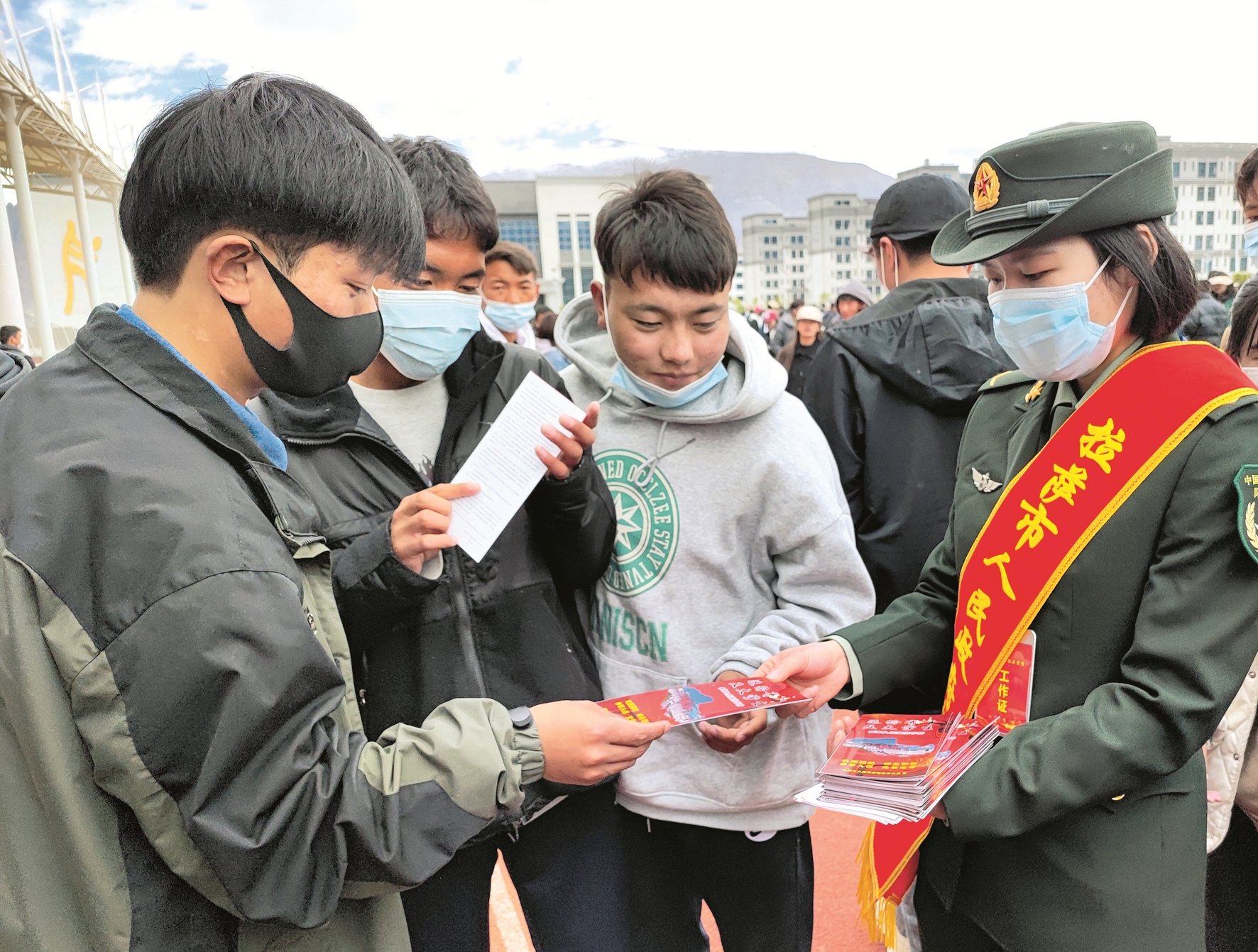 圖為市征兵辦工作人員向學生發(fā)放征兵宣傳資料。拉薩融媒記者 凃 瓊攝