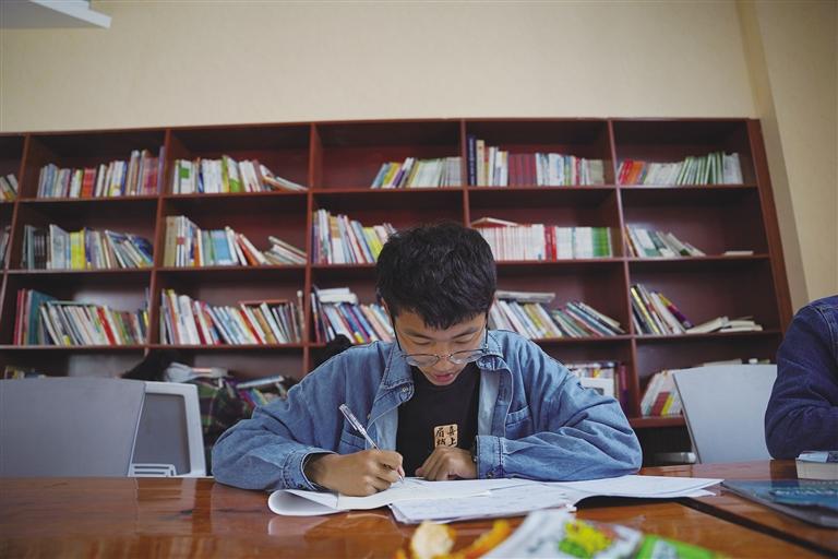 除了教室,閱覽室也是學(xué)習(xí)的好地方。在閱覽室,不少同學(xué)正奮筆疾書,只聽得見書頁翻動和筆尖書寫的“沙沙”聲。陽光透過玻璃傾瀉在書桌上,暖暖地照在這些青春的面龐,把他們點綴成五月里最美的風(fēng)景。閱覽室的最里邊,一位老師正在認(rèn)真講解試卷上的難題,不一會兒同學(xué)們就露出了恍然大悟的表情?!拔液芟矚g來閱覽室學(xué)習(xí),這兒比教室更安靜些,可以讓我靜下心來做題?!睂W(xué)生扎西江村說。