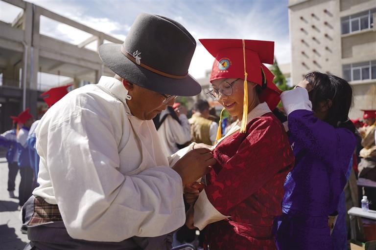 走進拉薩市第四高級中學,校園里每個角落都流露出喜悅與溫馨,同學們身著色彩鮮艷的民族傳統(tǒng)服裝,帶著自信的笑容,在父母與老師的陪伴下,走過“成人門”,踏上“成才路”,通向“成功門”。此時的他們意氣風發(fā),青春的面龐如同朝陽一般閃爍著光芒,滿懷豪情地憧憬精彩的人生。高三學生朗色占堆告訴記者:“今天是特別值得紀念的日子,以后我們都是成年人了,會勇于承擔責任,對自己的行為負責,努力成為一個有知識、知感恩、有責任、有擔當?shù)男聲r代新青年?!?/p>
