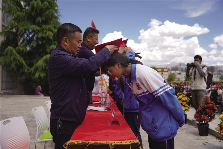 冠笄之禮,是中華民族重要的文化遺產(chǎn),更是長大成人的象征?;顒又校瑢W們戴上成人禮帽,以成人的姿態(tài)、豪邁的語調(diào)向著鮮艷的五星紅旗莊嚴宣誓,向祖國、向社會、向未來作出了莊重的承諾。拉薩市第四高級中學副校長陸彭飛對這群充滿蓬勃朝氣和無限希望的學子們表達了衷心的祝愿,他希望同學們懷揣感恩之心,敢于拼搏、勇于超越,用奮斗給自己最美的青春交上一份滿意的答卷。