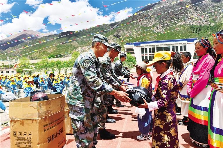 官兵代表向?qū)W生們捐贈禮品。
