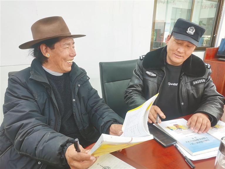 圖為聶孜村第一書記旦增(右)與村黨支部書記米瑪(左)正在用國(guó)家通用語(yǔ)言進(jìn)行情景模擬對(duì)話。記者 汪純 攝