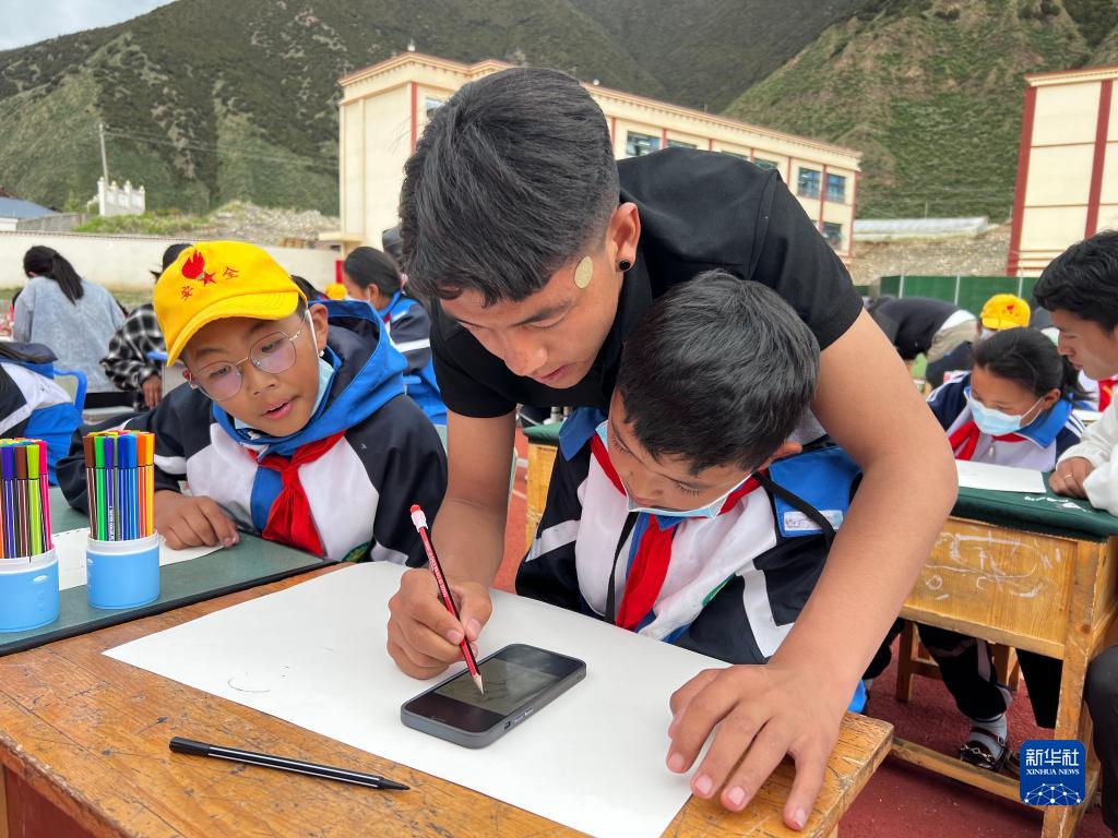 西藏大學(xué)美術(shù)專業(yè)學(xué)生為工布江達(dá)縣小學(xué)孩子們輔導(dǎo)繪畫。(受訪者供圖)