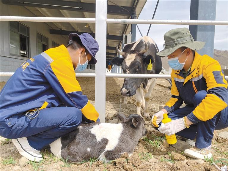 走進格桑塘現(xiàn)代農(nóng)牧產(chǎn)業(yè)示范園,工作人員強久和土旦達杰嫻熟地在給小奶牛的肚臍消毒,這是他們工作3年時間順利接生的第43頭小奶牛。