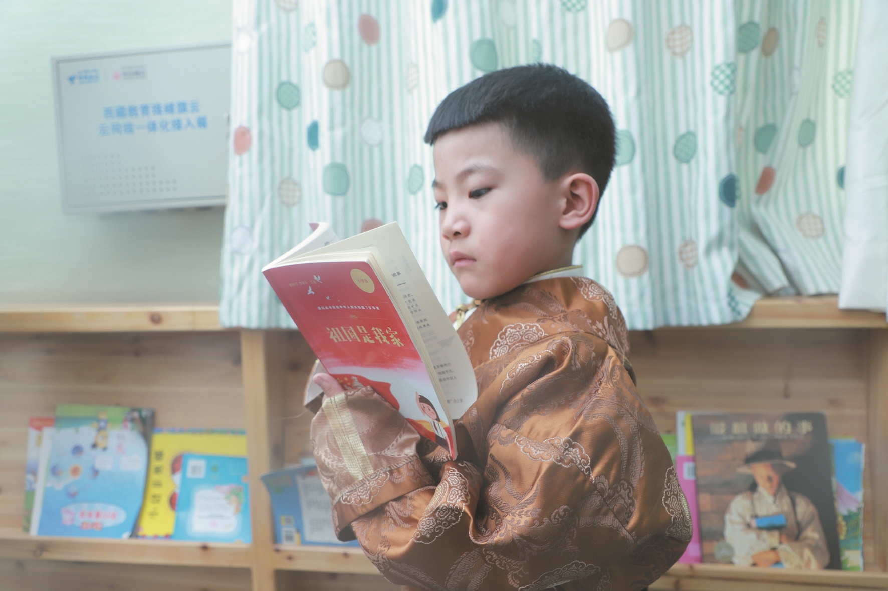 圖書館里,來自拉薩市江蘇實驗幼兒園大五班的小朋友益西加措仔細(xì)地挑選著自己喜歡的書籍,只見他饒有興致地選中這本《祖國是我家》,并發(fā)現(xiàn)了書中“我在南京,我為中華之崛起而讀書”的卡片時,他回應(yīng)道:“我在西藏,我為中華之崛起而讀書?!?/p>