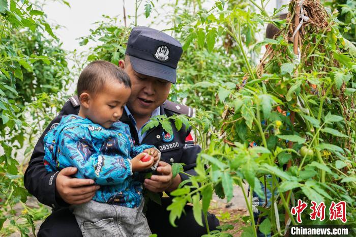 圖為亞?wèn)|出入境邊防檢查站民警與龐達(dá)村雙語(yǔ)幼兒園小朋友共同采摘成熟了的西紅柿。 李錦輝 攝