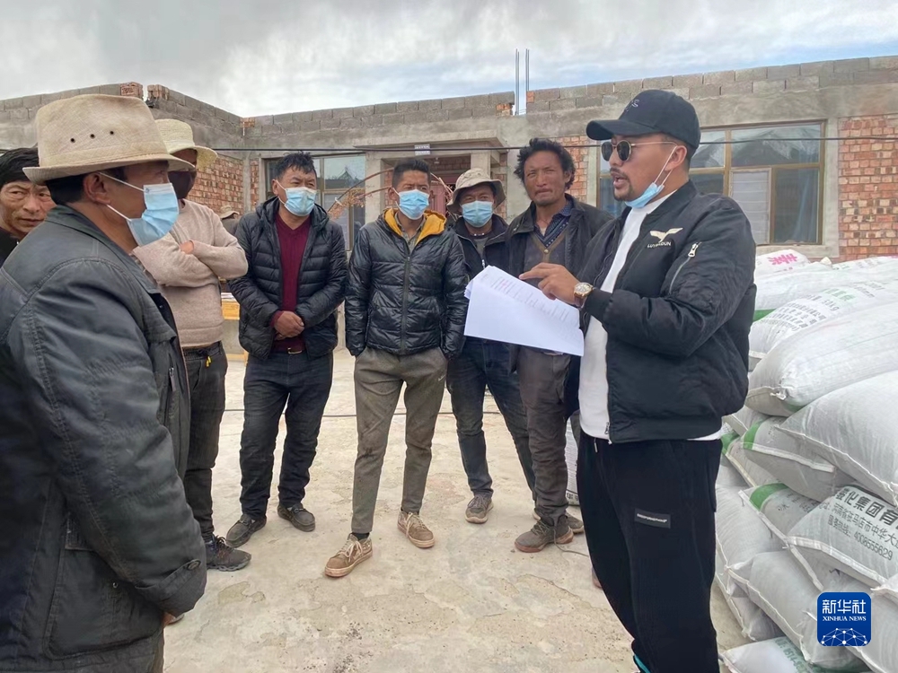 2021年4月13日,拉東才索南(右一)正給農民發(fā)放黑青稞種子。(受訪者供圖)