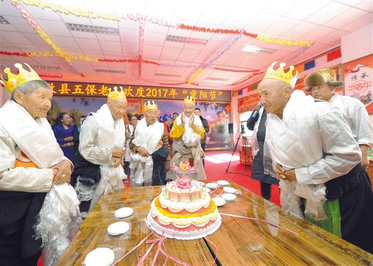 社會保障兜底一批。2021年,農(nóng)村居民最低生活保障標準達到5060元/年/人,城鎮(zhèn)居民最低生活保障標準達到10920元/年/人。圖為2017年10月28日,西藏自治區(qū)拉薩市達孜區(qū)特困人員集中供養(yǎng)服務中心為80歲老人們集體過生日。