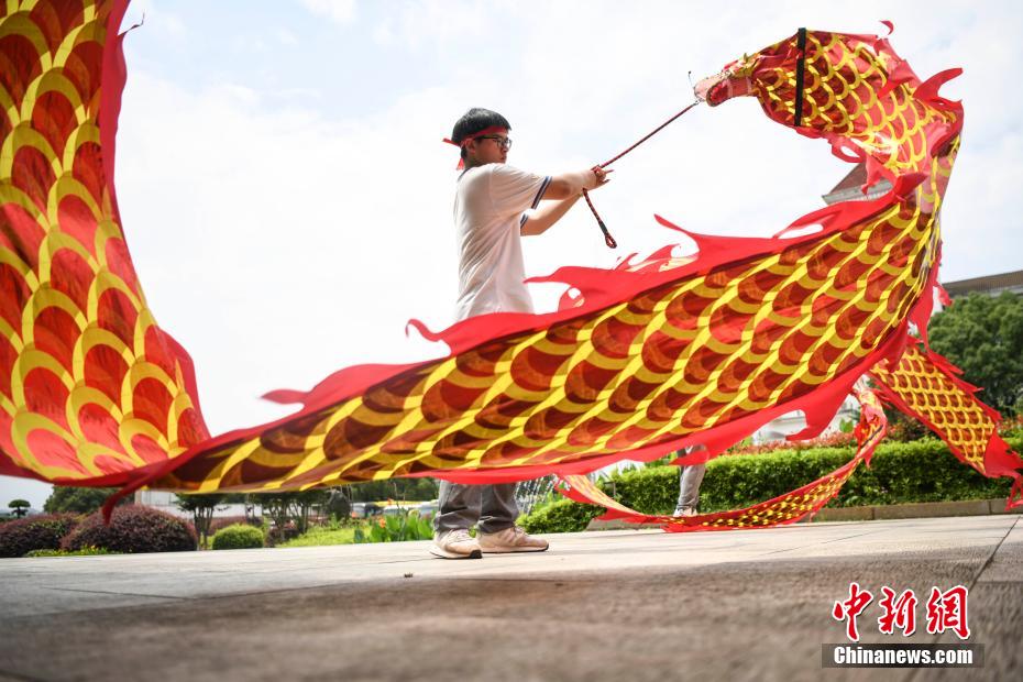 資料圖:低年級(jí)的學(xué)生為考生舞龍加油。 楊華峰 攝