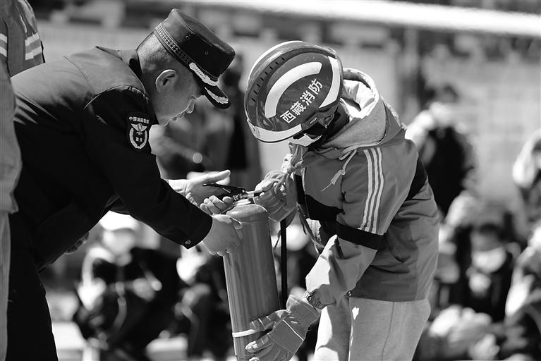 圖為消防知識進(jìn)校園活動(dòng)中,消防員手把手教學(xué)生學(xué)習(xí)使用滅火器。(圖片由山南市消防救援支隊(duì)提供)