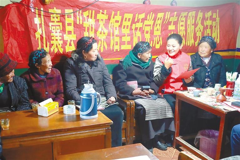 圖為扎囊縣新時代文明實踐志愿者在甜茶館與群眾話黨恩。記者 段敏 攝
