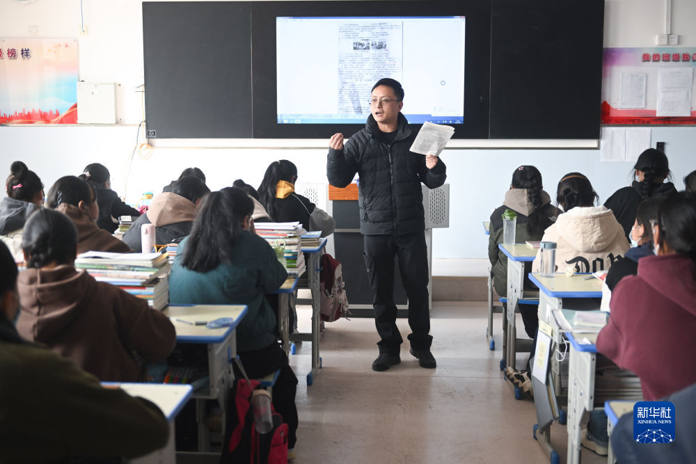 2月23日,上海援青教師鐘祖華在給學(xué)生上課。新華社記者 張龍 攝