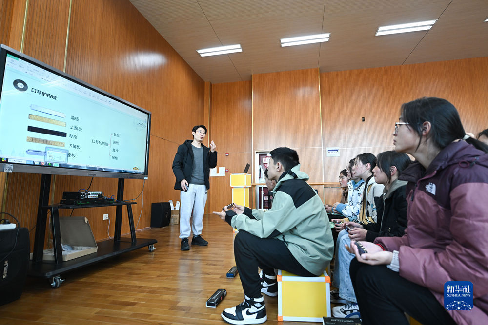 2月23日,上海援青教師闞延俊在給學(xué)生上音樂課。新華社記者 張龍 攝