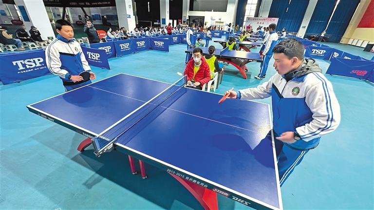 成人男子組在進(jìn)行乒乓球比賽。