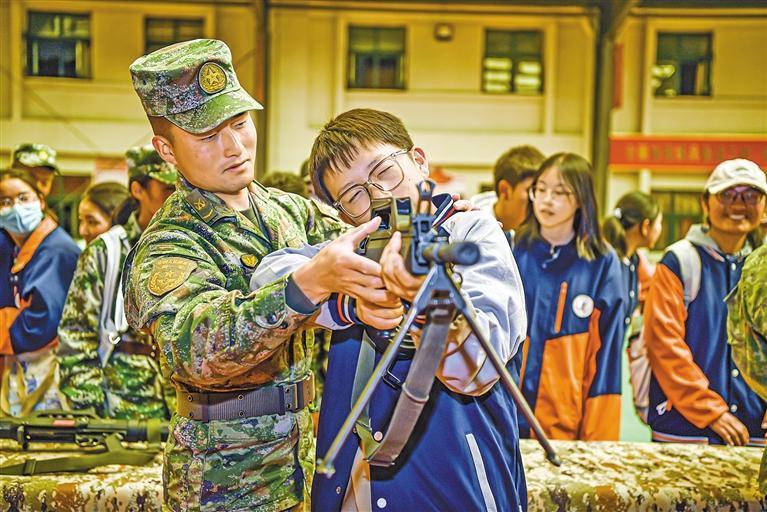 追憶崢嶸歲月,堅定鏗鏘步伐。榮譽室內,一幅幅照片、一行行文字、一件件實物,直擊師生心靈。在講解員的娓娓道來中,師生感受著先輩們頑強拼搏、百折不撓的革命精神。體驗武器裝備時,解說員的細心講解和嫻熟操作,讓學生對武器裝備有了更加直觀的印象。不少學生在官兵的指導下“零距離”接觸武器裝備,真實體驗“手握鋼槍”的現(xiàn)實感。此次活動進一步促進了軍地交流,加深了軍民關系,為現(xiàn)場師生上了一堂生動的國防教育課。