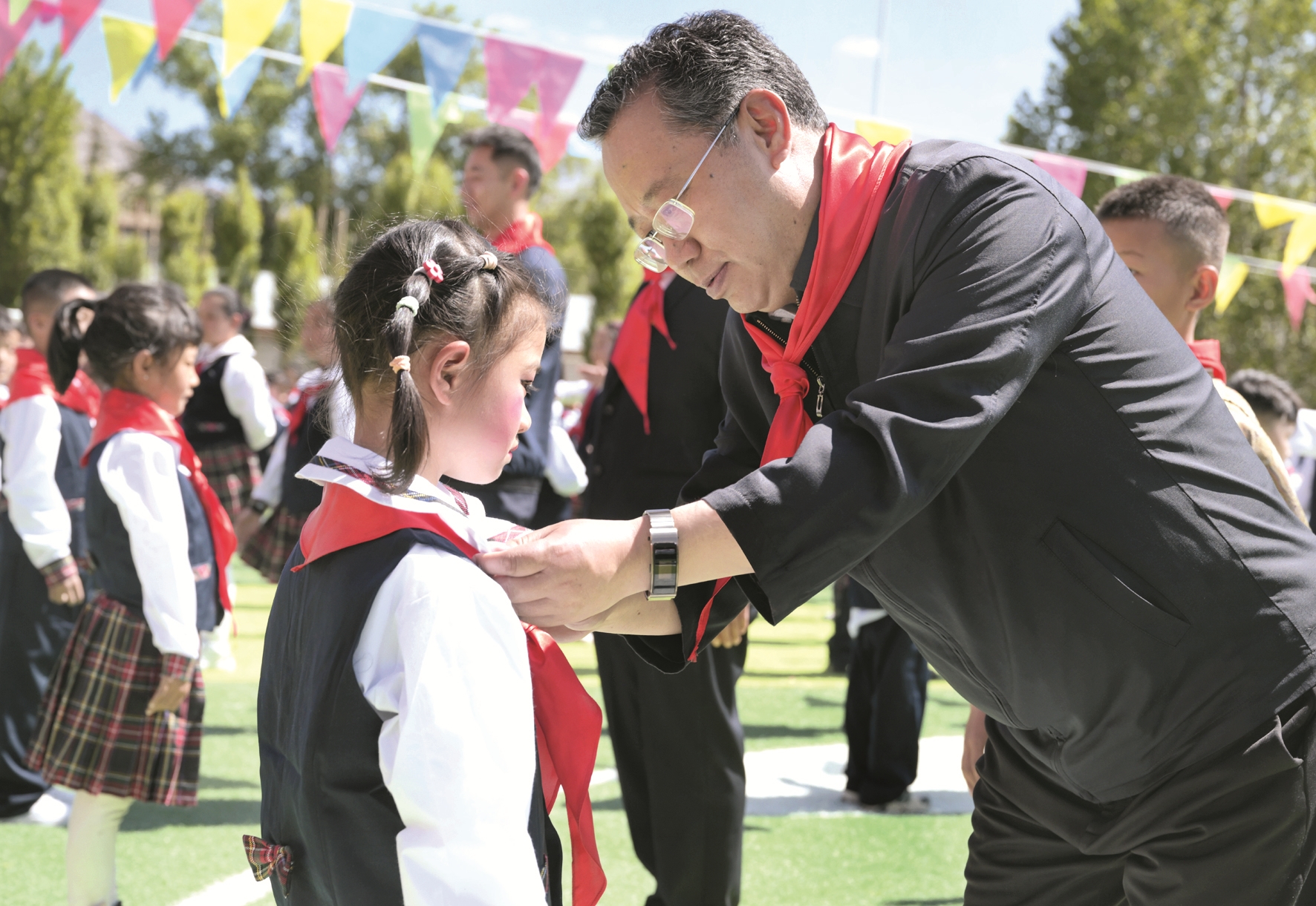 6月1日,西藏自治區(qū)黨委常委、市委書(shū)記普布頓珠來(lái)到市實(shí)驗(yàn)小學(xué)、實(shí)驗(yàn)幼兒園走訪慰問(wèn)。這是普布頓珠在市實(shí)驗(yàn)小學(xué)為少先隊(duì)新隊(duì)員授紅領(lǐng)巾。拉薩融媒記者 貢覺(jué)群培攝
