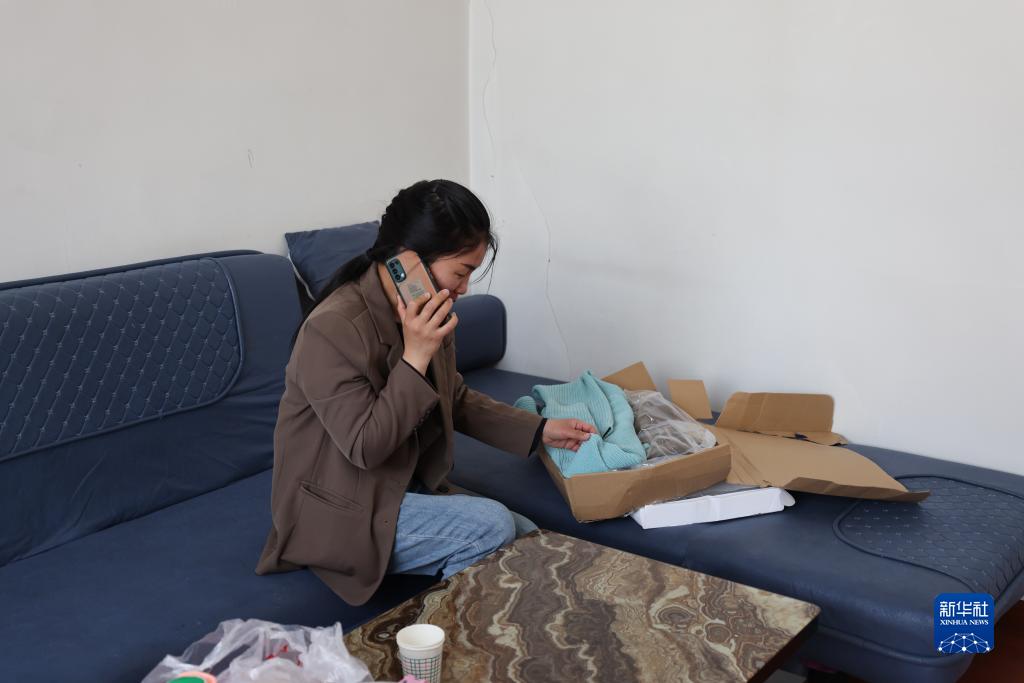 收到媽媽寄來的衣物后,潘紅培在與媽媽通話。(受訪者供圖)