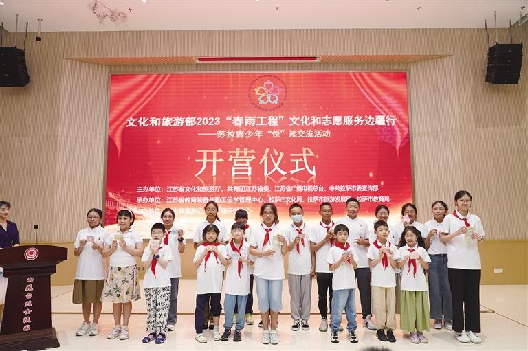 為貫徹文化和旅游部、國家民委2023年關(guān)于文化和旅游志愿服務(wù)邊疆行部署要求,推動(dòng)落實(shí)江蘇省對(duì)口援建工作任務(wù),由江蘇省文化和旅游廳、共青團(tuán)江蘇省委、江蘇省廣播電視總臺(tái)、拉薩市委宣傳部聯(lián)合主辦,江蘇省教育與勤工儉學(xué)管理中心、拉薩市文化局、拉薩市旅游發(fā)展局、拉薩市教育局聯(lián)合承辦,新中安童游記、夫子廟研學(xué)中心協(xié)辦的2023年度“春雨工程”蘇拉結(jié)對(duì)合作項(xiàng)目——蘇拉青少年“悅”讀交流活動(dòng)開營儀式8月7日上午在江蘇省南京雨花臺(tái)烈士陵園啟動(dòng)。江蘇省文化和旅游廳公共服務(wù)處副處長(zhǎng)陳兵、拉薩市文化局一級(jí)調(diào)研員范躍平、拉薩市圖書館館長(zhǎng)朱純琳、新中安童游記常務(wù)副總裁余靜等參與單位領(lǐng)導(dǎo)嘉賓以及來自拉薩的10名青少年和江蘇本地的10名青少年一起參加了開營儀式。