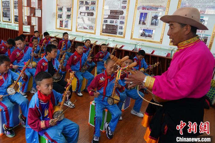 待弦子興趣班30多名學生坐下,定主如往常一樣,首先帶領學生們校準弦子的高低音,接著才是傳授新曲子。他要求學生不僅會拉奏樂曲旋律,還要能吟唱歌詞,“地處高高的雪山,菩提樹兒把根扎,賓客是花白牦牛,菩提樹兒長得高,牦牛呀膘肥體壯,菩提樹兒葉茂盛……”