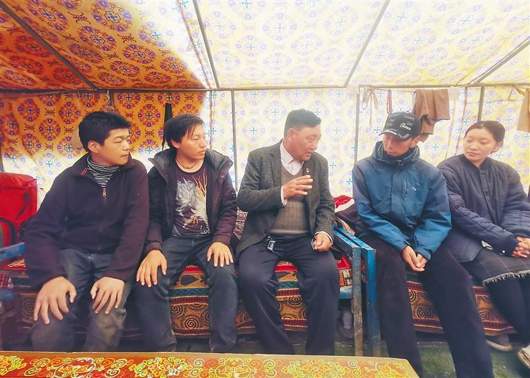 圖為“全國模范人民調(diào)解員”扎西次加(中)在那曲市比如縣恰則鄉(xiāng)孔瑪奪村蟲草采集點(diǎn)向群眾宣講法律知識(shí)。