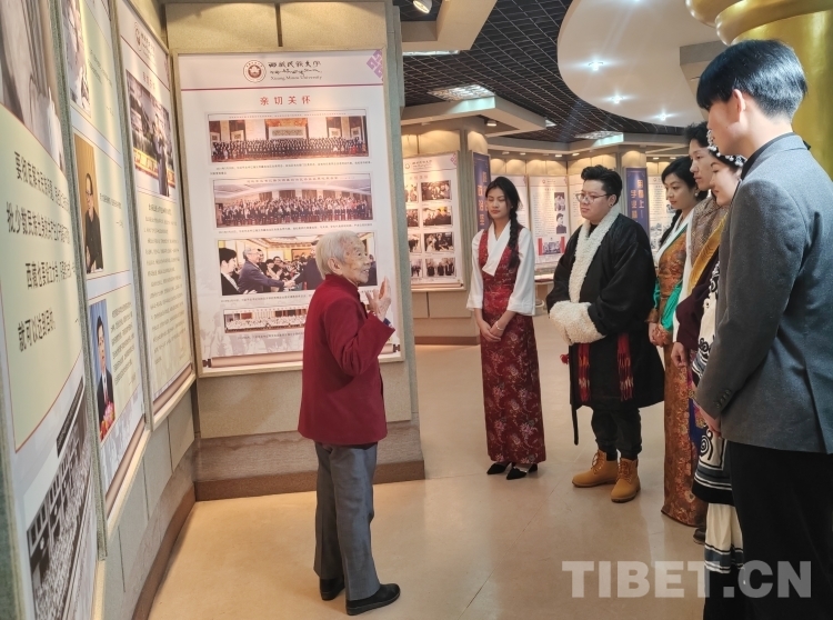 圖為西藏民族大學(xué)老教師為學(xué)生講解西藏民族大學(xué)建校歷程