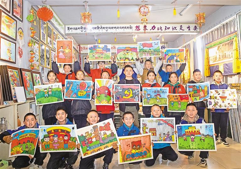 圖為桑日縣中學美術興趣社團的孩子們展示以“鑄牢中華民族共同體意識”為主題的繪畫作品。 次仁龍布 記者 洛桑 攝