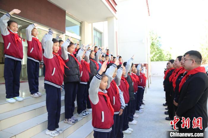 圖為學生們正在為法院干警們敬少先隊隊禮。倫珠澤仁攝