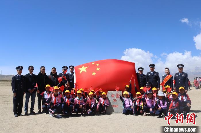 圖為民警和師生共向界樁致敬。里孜出入境邊防檢查站供圖