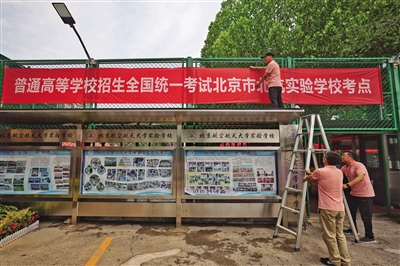 6月6日,記者在北京航空航天大學(xué)實驗學(xué)校中學(xué)部(簡稱“北航實驗學(xué)?!保┛键c看到,學(xué)校西門處已懸掛起高考考點橫幅、考場布置已就位,校園內(nèi)放置了多個溫馨的提示語標(biāo)牌。據(jù)悉,該校是今年新增高考考點之一,承接來自9所學(xué)校277名考生的高考組考任務(wù)。此外,記者還探訪了北京高考人大附中經(jīng)開學(xué)校考點