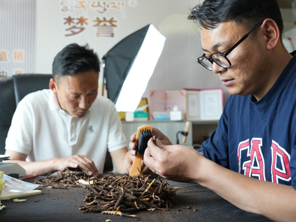 羅拉(右)在公司內清潔新鮮蟲草(5月31日攝)。新華社記者丁汀 攝