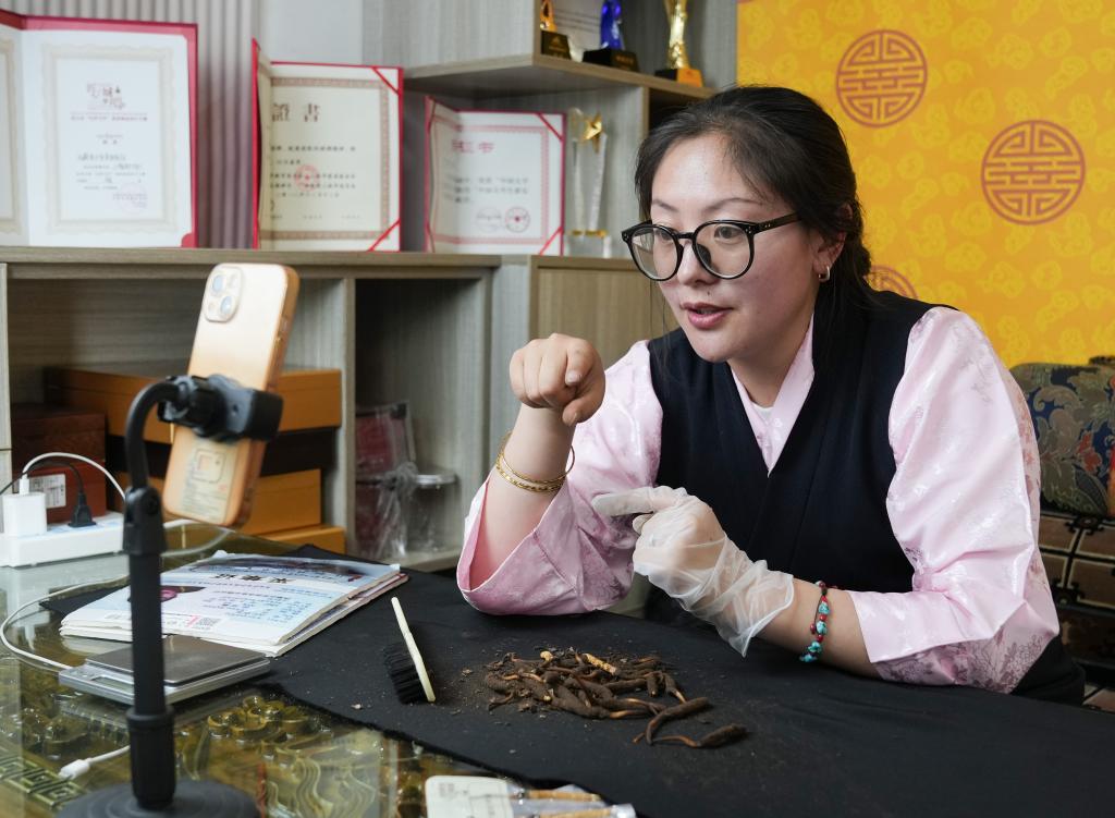 在夢譽蟲草產業(yè)帶直播基地,羅拉的妻子次仁白吉在直播帶貨(5月31日攝)。新華社記者丁汀 攝