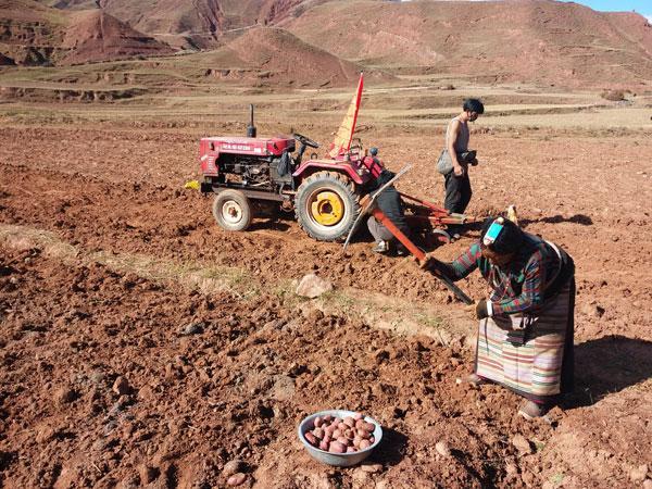 在充分調研的基礎上,嘎瑪澤加從本村實際出發(fā),積極爭取項目、資金支持,于2014年起牽頭在全村推廣紅土豆和藍青稞特色產業(yè)種植工作。經過不斷努力,成功將覺恩村紅土豆種植面積擴大到1200畝、藍青稞1000畝,這兩項種植業(yè)每年為群眾創(chuàng)收430萬元,使群眾看到了發(fā)展特色種植產業(yè)帶來的實實在在的經濟效益。