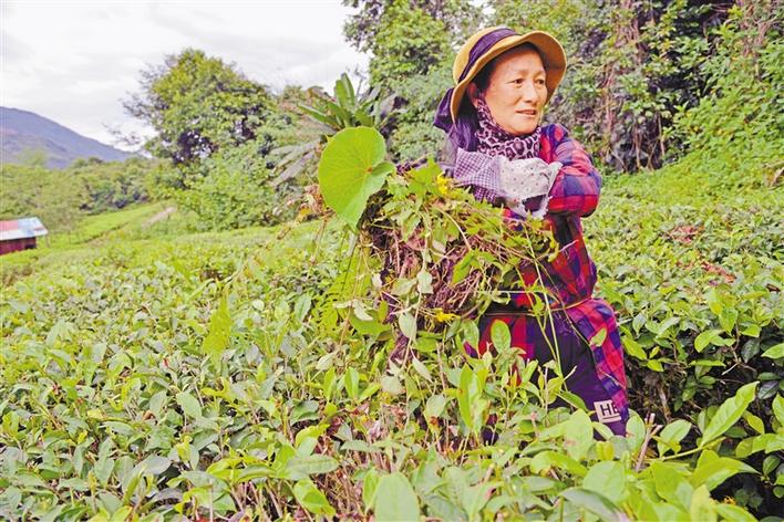 圖為墨脫縣背崩鄉(xiāng)背崩村村民在茶場給茶樹修剪枝葉。記者 張猛 通訊員 王顯琴 攝